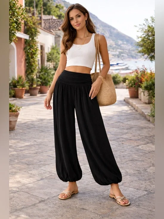 boho pants wide leg pants bubble hem pants fold over waist Italian pants resort wear coastal grandma flowy pants minimalist chic travel outfit