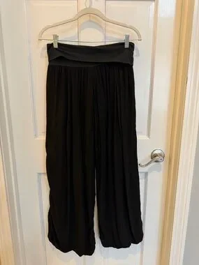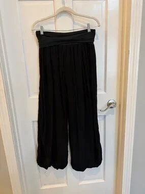 Chic and effortlessly cool Made in Italy wide leg pants featuring a flattering fold-over waistband and unique bubble hem silhouette. These have that elevated European boutique vibe—perfect for travel, resort wear, or everyday boho styling.