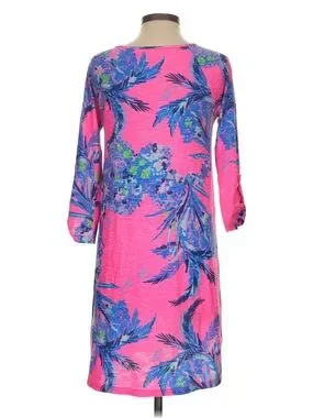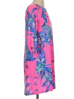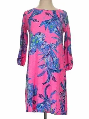 Vibrant pink shift dress with bold blue and purple tropical leaf and floral print. Lightweight, flowy silhouette with three-quarter sleeves. Eye-catching color and print perfect for sunny days or vacations.