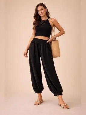 anthropologie hei hei pants gauze pants balloon pants jogger pants black boho pants minimalist outfit travel pants capsule wardrobe coastal grandma comfy chic