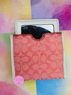 Authentic Coach compact mirror featuring the iconic pink monogram “C” print on canvas with white leather trim. A super cute and functional Y2K accessory that’s perfect for your bag or collection.