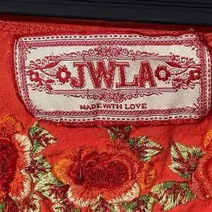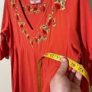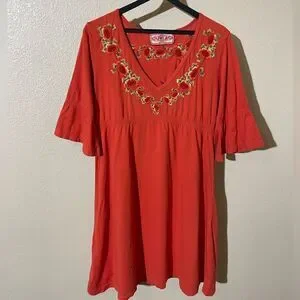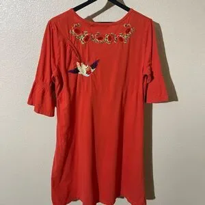 Vibrant Red mini dress. Features floral embroidery. Flared sleeves. V-neckline.