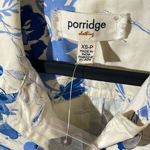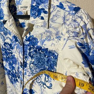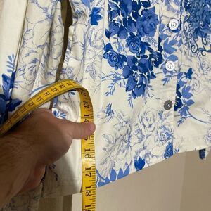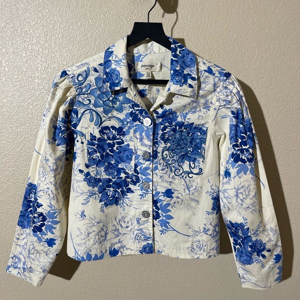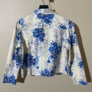 Elevate your style with the Women's Blue Floral Jacket. This chic jacket features a stunning blue floral design on a cream background, perfect for adding a touch of elegance to any outfit.