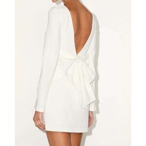 NWT Elegant long sleeve mini dress features a striking open back design accented with a large, statement bow for a sophisticated yet playful look. Crafted from a smooth, slightly stretchy fabric, it offers a tailored silhouette with a clean round neckline and a hidden side zipper closure. Length 31in, pit to pit 17in.