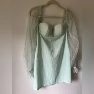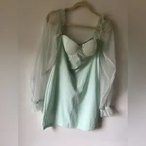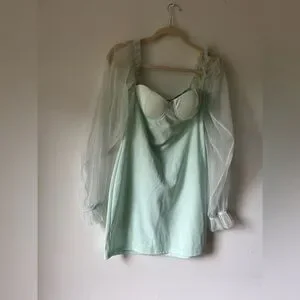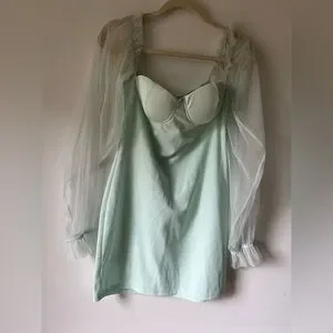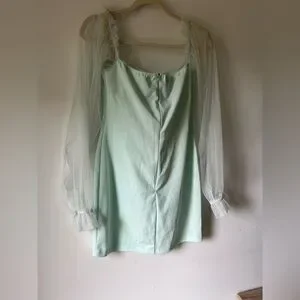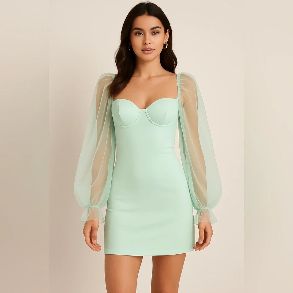 Elegant and feminine mini dress by Eilly Bazar in a soft mint green shade. Features a structured sweetheart neckline with built-in cups, sheer long puff mesh sleeves with ruffle detail at the shoulders and elasticated cuffs, and a smooth satin-like body for a flattering fit. Back zipper closure for ease of wear.