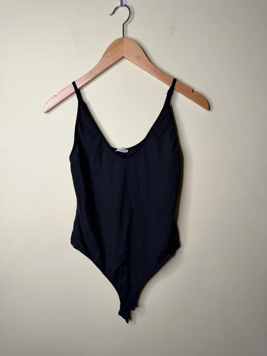 Classic black scoop neck bodysuit with thin straps. Smooth, versatile design. Great for layering or wearing alone.