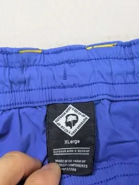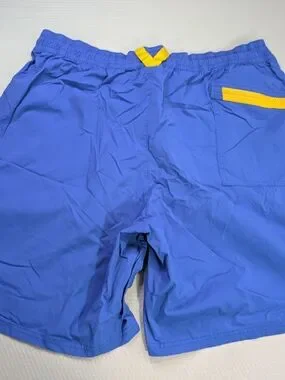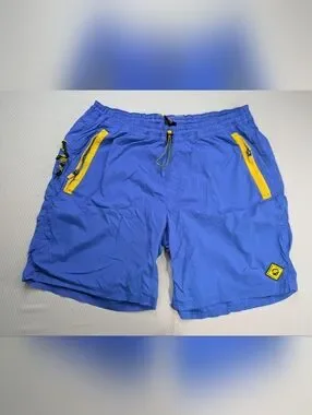 Lightweight REI men's shorts for active use. Elastic waistband with drawcord. Zippered pockets with yellow trim. Quick-dry fabric. Casual athletic style.