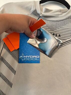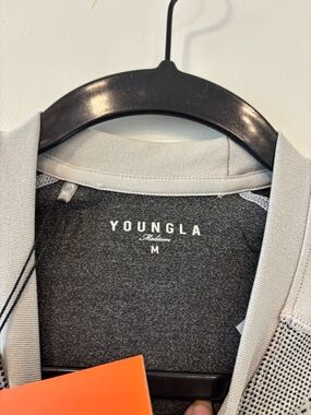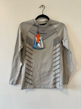 Light gray long sleeve performance tee by YoungLA. Breathable fabric with patterned black ventilation accents. Crew neck and raglan sleeves. Tags attached for new condition.