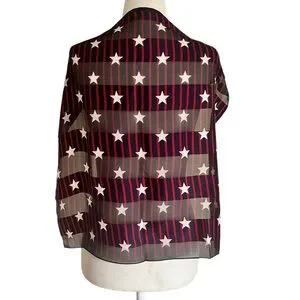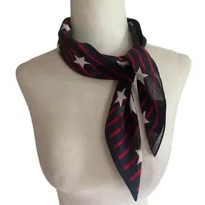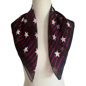 Classic vintage sheer square scarf in a red, white, and blue color scheme with an allover star and stripe print. Measures 21” x 21”, perfect as a neckerchief, hair accessory, or handbag tie. The fabric has a silky texture, likely silk or a silk blend, but no tag is present to confirm material.