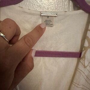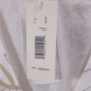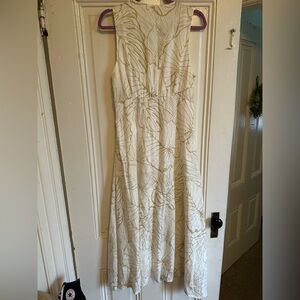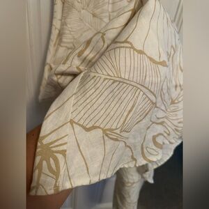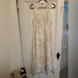 Magaschoni sleeveless linen maxi dress with a V-neck. Ivory fabric patterned with gold leaf outlines. Flowy silhouette that drapes softly. Subtle metallic print adds a touch of shimmer. Perfect for beach photos, bridal events, vacation, getaway, family photos.