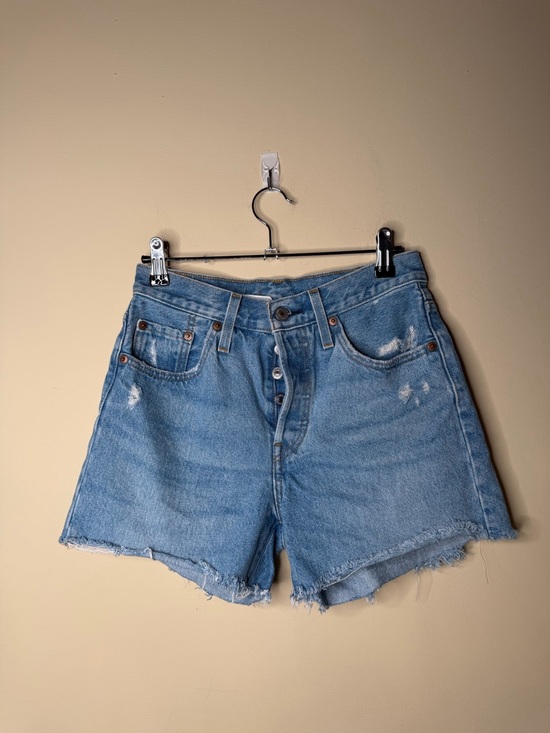 Levi's high-waist denim shorts. Light blue wash with subtle distressing. Button fly and classic five-pocket design. Frayed hem for a laid-back vibe.