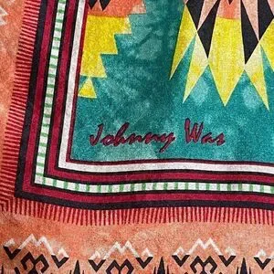 Vibrant scarf with intricate patterns. Features a mix of colors including pink, yellow, green, and blue. Perfect for adding a pop of color to any outfit.