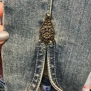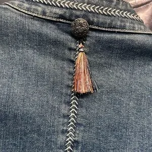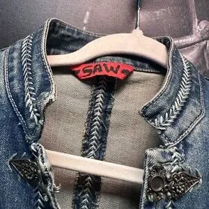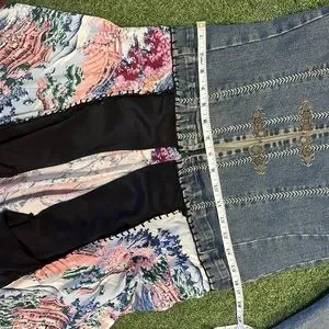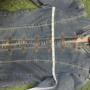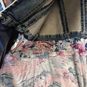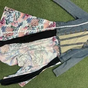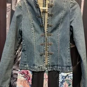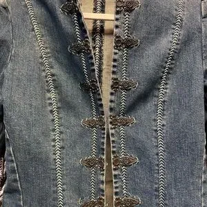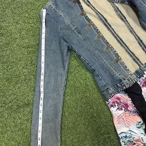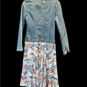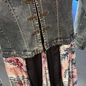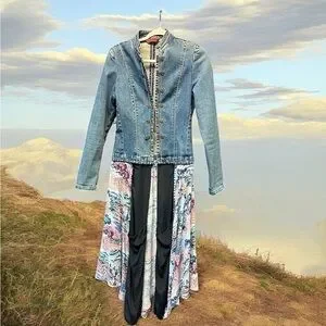 Stylish denim blue jacket paired with a vibrant floral skirt. Perfect for a chic and casual look.
