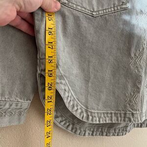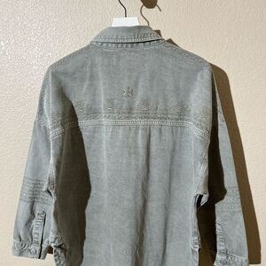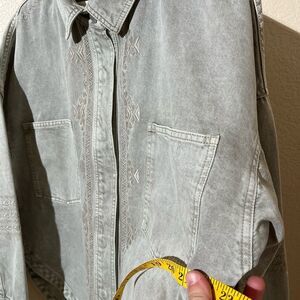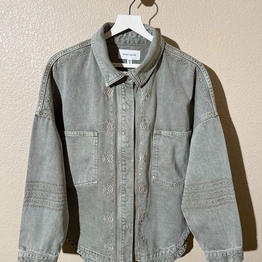Chic gray denim jacket with intricate embroidery. Perfect for casual outings. Stylish and comfortable.