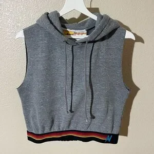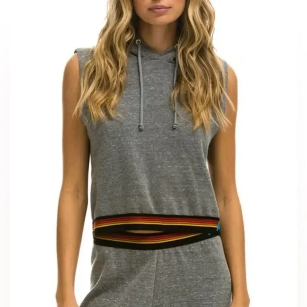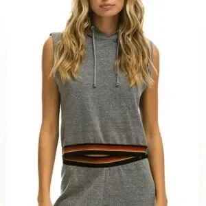 Chic sleeveless hoodie by Aviator Nation. Features a vibrant rainbow stripe. Ideal for casual wear.