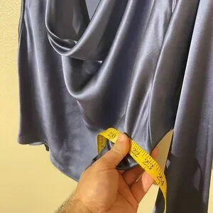 Luxurious navy satin blouse. Features elegant draped neckline. Perfect for chic occasions.