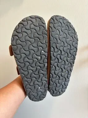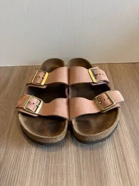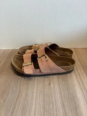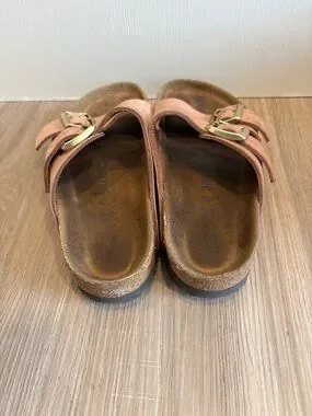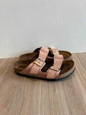 Suede double-strap sandals with metal buckles. Contoured cork footbed for support. Simple casual design for everyday wear.