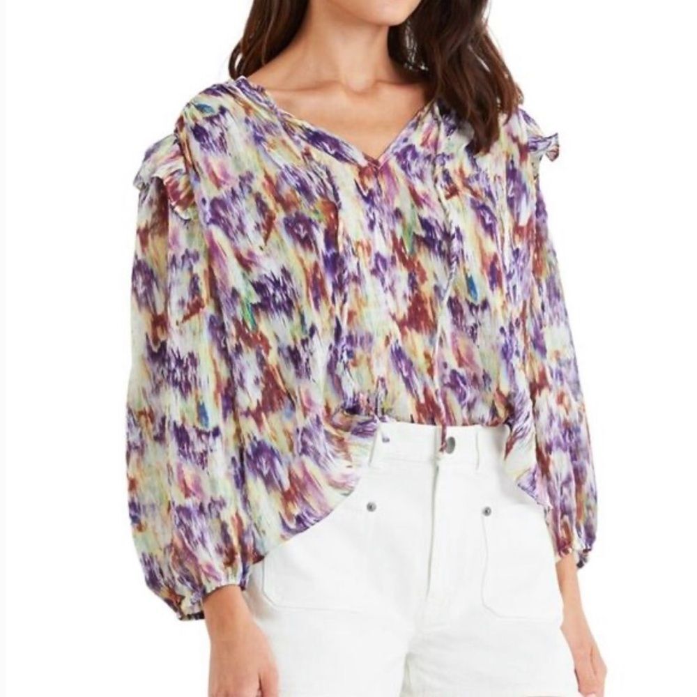 Chic blouse with a vibrant pattern. Features purple, cream, and brown tones. Stylish and versatile for any occasion.