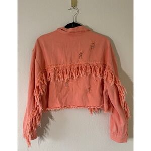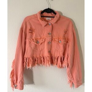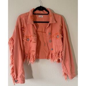 Excellent condition. POL Clothing cropped denim jacket in a vibrant salmon coral hue features heavy distressing and dramatic fringe detailing along the hem and sleeves. Crafted from 100% cotton, this bold piece includes a button-down front, dual chest pockets, and a raw, frayed aesthetic that adds a bohemian edge to any outfit. Length 18in, pit to pit 25in, sleeve length 26in.