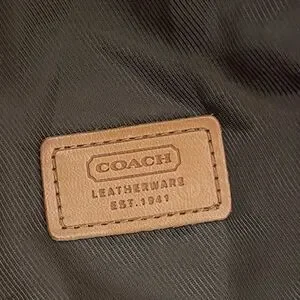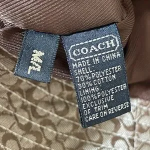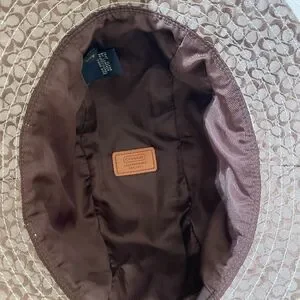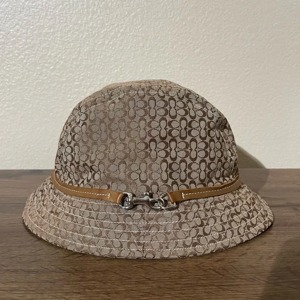 Stylish bucket hat with iconic Coach monogram. Features a tan color and elegant design.