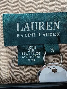 Lauren Ralph Lauren corduroy utility jacket in a light brown shade. Zip front with button-flap waist pockets. Chest zip pocket and classic collar. Buttoned sleeve cuffs for a tailored finish. Silk.