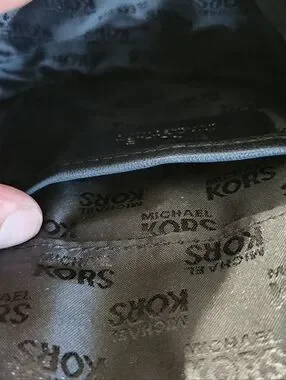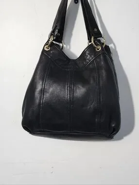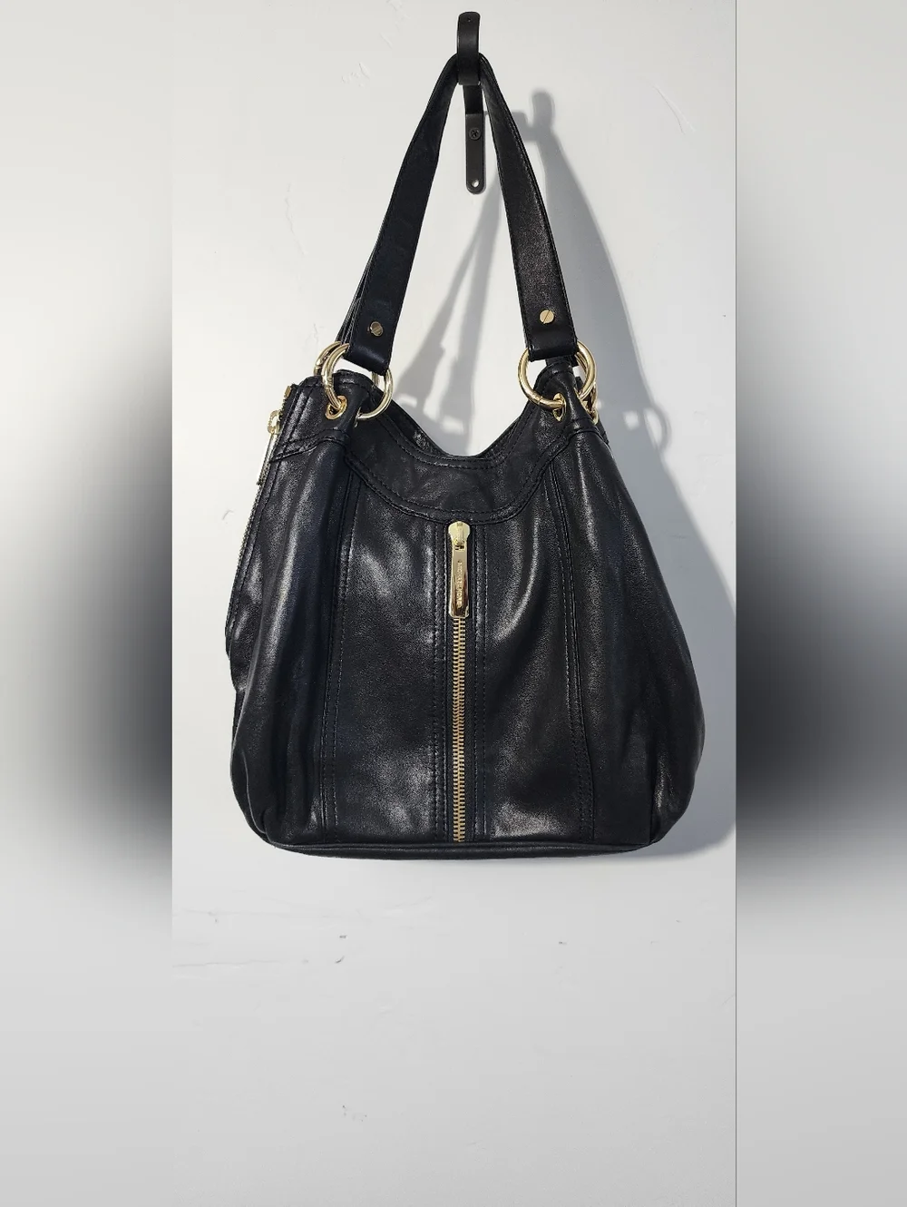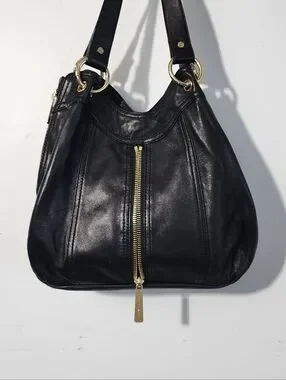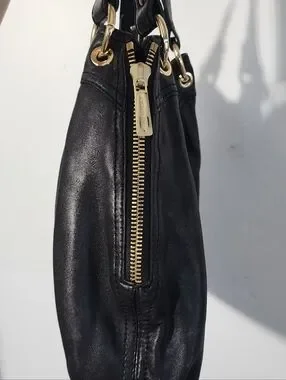 Soft black leather shoulder hobo by Michael Kors. Gold-tone hardware and front zip detail. Comfortable double shoulder straps. Classic silhouette for daily wear.