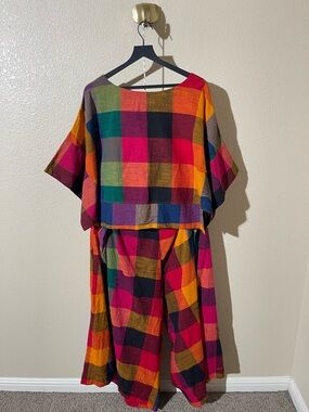 Bold multicolor plaid A-line midi skirt in vibrant fuchsia, orange, green, purple and black checks. Lightweight woven fabric with a tailored waist and soft pleats for graceful movement. Pairs easily with neutral tops for a standout look.