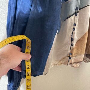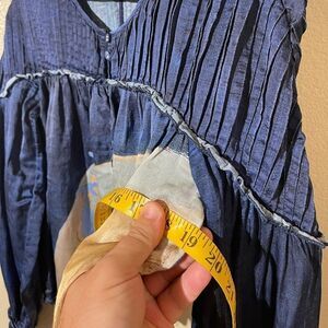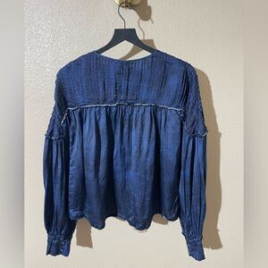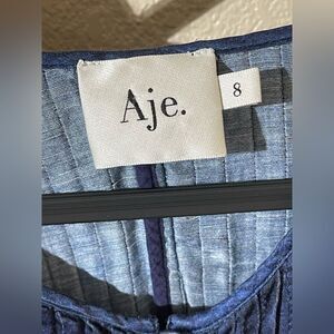 Chic Aje blouse with a blend of navy and multicolor design. Features button-down front and gathered details. Stylish and versatile.