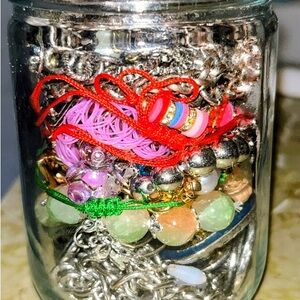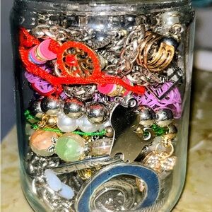 Mixed jewelry jar w/ silver and gold pieces. Necklaces, earrings, ear cufff, bracelets, and rings.