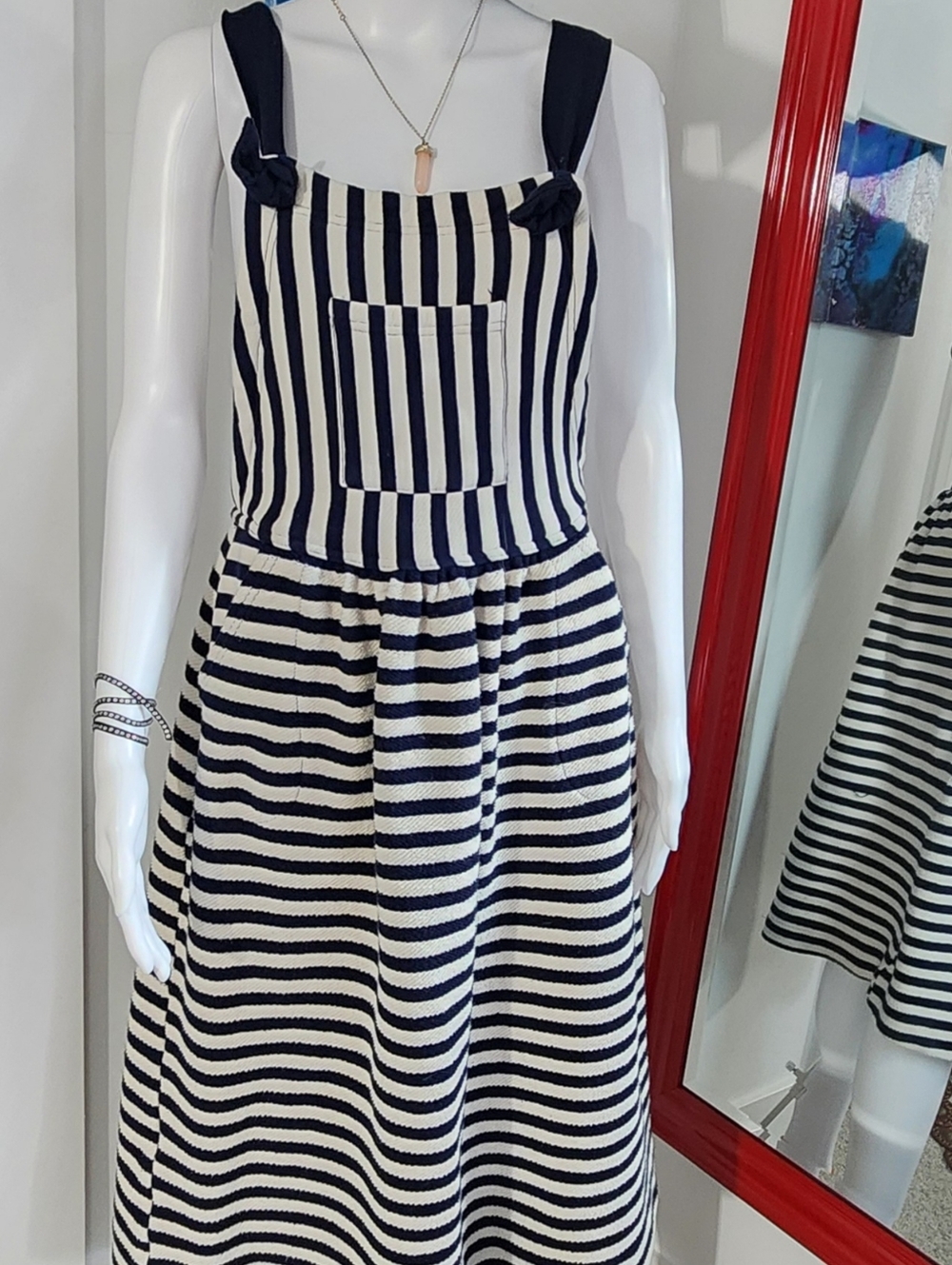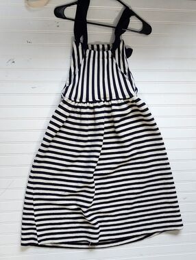 Playful striped sundress with front pocket. Knotted shoulder straps for a cute touch. Soft, breathable fabric ideal for warm days. Easy pull-on style for quick wear.