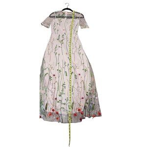 Embody timeless elegance with this breathtaking floral embroidered maxi dress. Featuring short, sheer sleeves and a flattering fitted waistline, this dress effortlessly enhances your natural silhouette. The soft hue contrasts beautifully with the bold floral accents, creating a sophisticated look. Ideal for formal gatherings or special occasions, this dress exudes a sense of refined charm that is sure to leave a lasting impression.