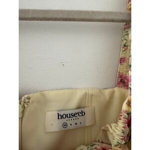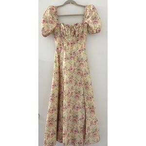 Excellent condition. House of CB Tallulah Lemon Floral Puff Sleeve Midi Sundress features a romantic garden-inspired print on a soft yellow backdrop. Classic milkmaid-style bodice, featuring a gathered bust with tie detail and structured puff sleeves that can be worn on or off the shoulder. The slim-fitting waist flows into a flared A-line skirt with a daring thigh-high side slit for added movement, hidden back zipper and full lining. Length 48in, pit to pit 13in, sleeve length 13in.