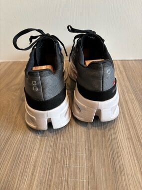 Lightweight breathable black mesh upper. Pale blue support straps and lace loop details. Thick white CloudTec-style midsole for cushioning. Lace-up closure for a secure fit. Designed for daily runs and training.