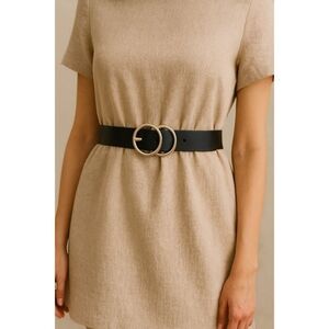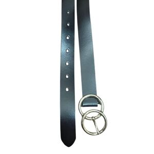 Crafted from smooth black leather with a modern double-ring gold buckle, it adds a polished accent to dresses, denim, trousers, and layered looks.