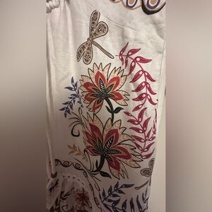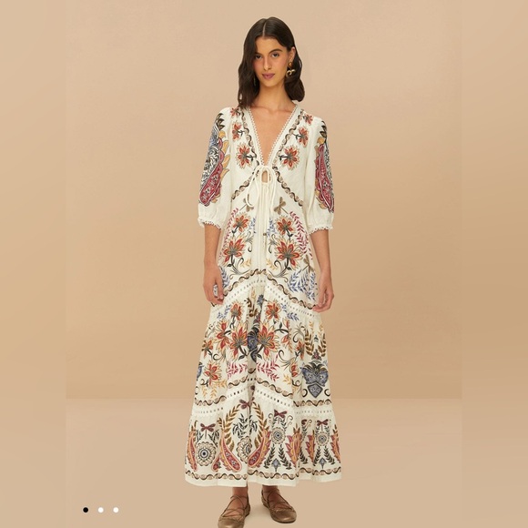 Elegant floral embroidered maxi dress in cream with colorful accents. Perfect for any occasion.