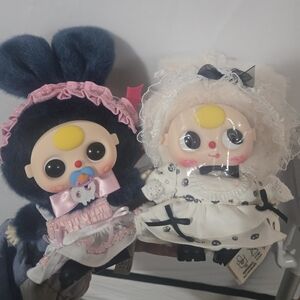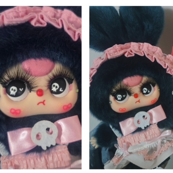 Adorable gothic doll with a pink and black outfit. Features a pink bow and skull details. I am a collector and artist.