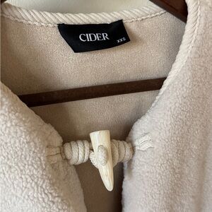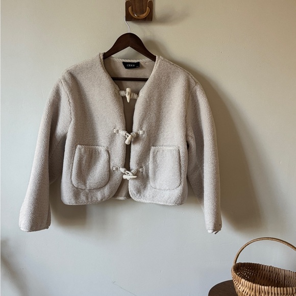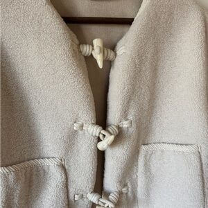 Elegant cream coat with unique toggle detail. Soft texture for comfort.