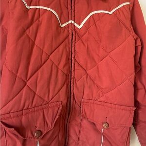 Stylish red quilted jacket featuring a unique western design. Perfect for adding a pop of color to your wardrobe.