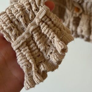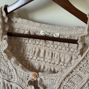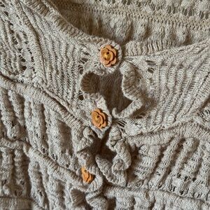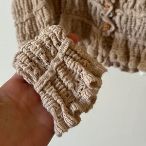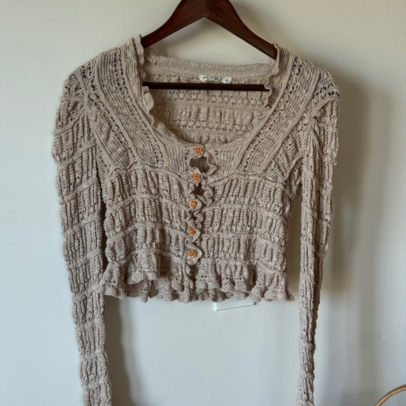 Cozy knit top with button-up front. Features a scalloped neckline. Long sleeves with textured design.