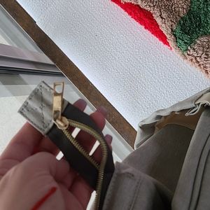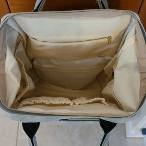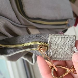 Light olive green diaper backpack. INSIDE IS WATERPROOF. No rips or stains. One zipper is off track on the main compartment but the other one works fine to close it.