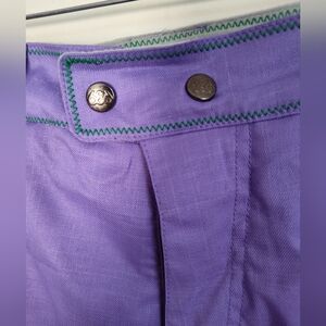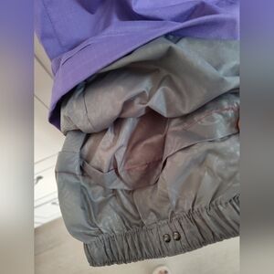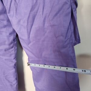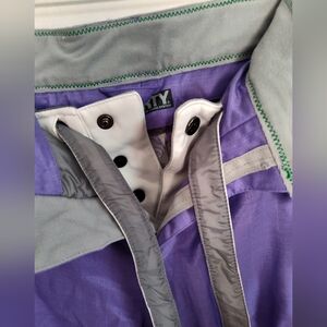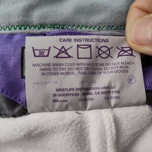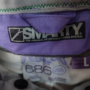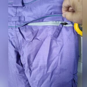 These Girls 686 purple snow pants in size Large with a 25" inseam are brand new with tags and feature a detachable liner for added versatility. The pants have a snap closure, elastic waist, and are waterproof and insulated for cold weather conditions. With a stylish purple color and a theme perfect for skiing, snowboarding, and winter sports, they also include zip and pockets for convenience. These snow pants are designed for comfort and performance on the slopes, making them a great choice for outdoor winter activities.