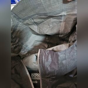 This is a Women's Outdoor Research Helium II rain jacket in a size Large and a sleek black/charcoal color. This popular, award-winning jacket is in excellent condition with no signs of wear, tears, or zipper defects, and all seams are fully intact.