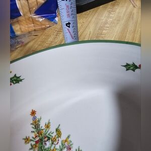 This vintage 2010 piece features the classic Radko Christmas Tree design with a festive holly and red ribbon rim. A perfect addition for collectors or as a replacement piece for a holiday set. Microwave and dishwasher safe.
