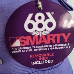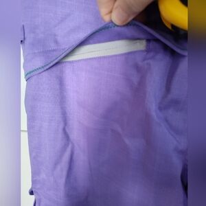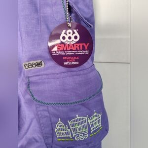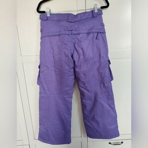 These Girls 686 purple snow pants in size Large with a 25" inseam are brand new with tags and feature a detachable liner for added versatility. The pants have a snap closure, elastic waist, and are waterproof and insulated for cold weather conditions. With a stylish purple color and a theme perfect for skiing, snowboarding, and winter sports, they also include zip and pockets for convenience. These snow pants are designed for comfort and performance on the slopes, making them a great choice for outdoor winter activities.