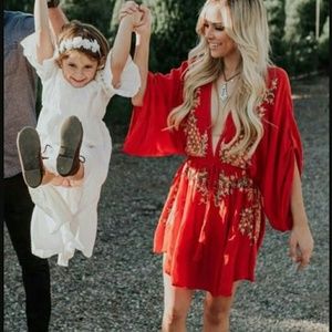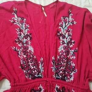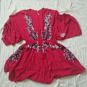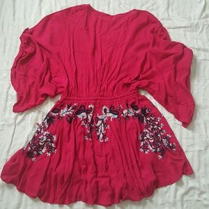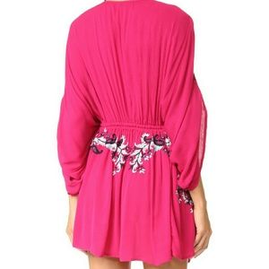 Free People embroidered dress. Perfect for concert or festival. Also perfect as a cover for bathing suit. Plunging neckline & elastic tassled drawstring waist. Light & breezy. The color is just like the first 3 pictures. A gorgeous pink/fuchsia. (*Note: small is brand new, never worn but does not have a tag. It does still have the plastic that holds the tag & also has the extra button inside a plastic bag attached.) Just lowered.