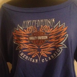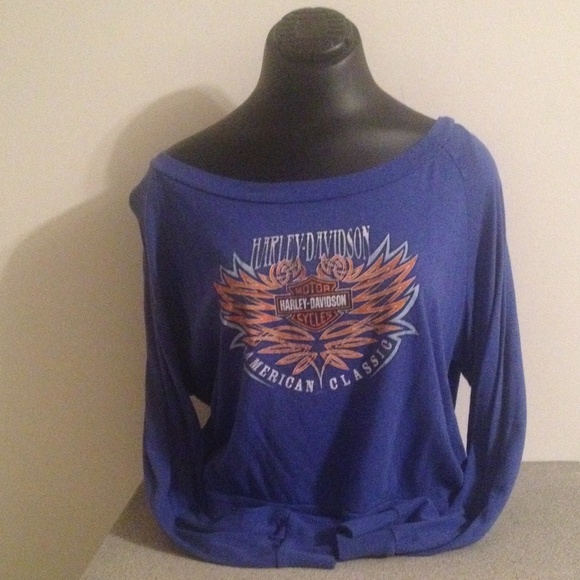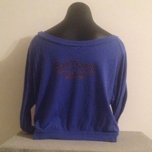 Royal blue with orange and white print. This was my favorite sweatshirt! It's super thin and comfy. Oversized and cropped. It's a little faded and worn but there isn't any damage. Perfect for spring weather! Make an offer! :) Also great for bundling with my other HD items!!