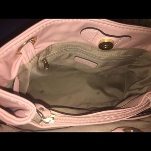 In excellent condition! Pale/nude pink bag w/ stunning gold hardware & details! Features "side zip" to unzip to make bag slightly larger. Pic #6 shows 2 very small spots on bottom, inside lining. No other imperfections. Approx. 8"H x 11.5W x 4"D.