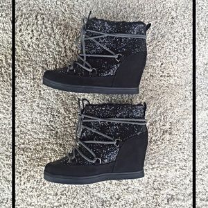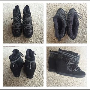 💝Ooh La La💝Black glitter ankle booties with 4 inch hidden wedge heel by Juicy Couture. Micro suede upper - faux fur lining - lace up closure - padded footbed. NEW Size 7