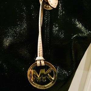 EXCELLENT CONDITION black Michael Kors patent leather tote bag; I used this as a purse for a few months. No visible wear such as stains, ink spots, odors, etc. Gold hardware and details including hanging MK emblem. Button closure and interior pockets (including zipper pocket) for organization :)