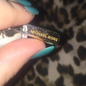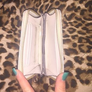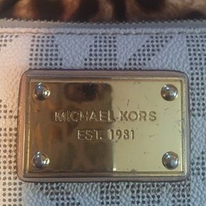 Michael kors Vanilla Jet set wristlet wallet. Only wear on the outside is on the Michael kors name plate and the zipper, there is also some staining around the zipper, on the inside there is staining but it is still perfectly usable. Has 3 card slots has a middle pocket and a pocket on the side for cash.